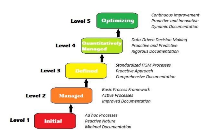 An ITSM Maturity Model is the framework that gives the assessment its structure and direction. It categorizes organizational capabilities into progressive levels, from initial/ad-hoc processes to optimized, strategic ones.